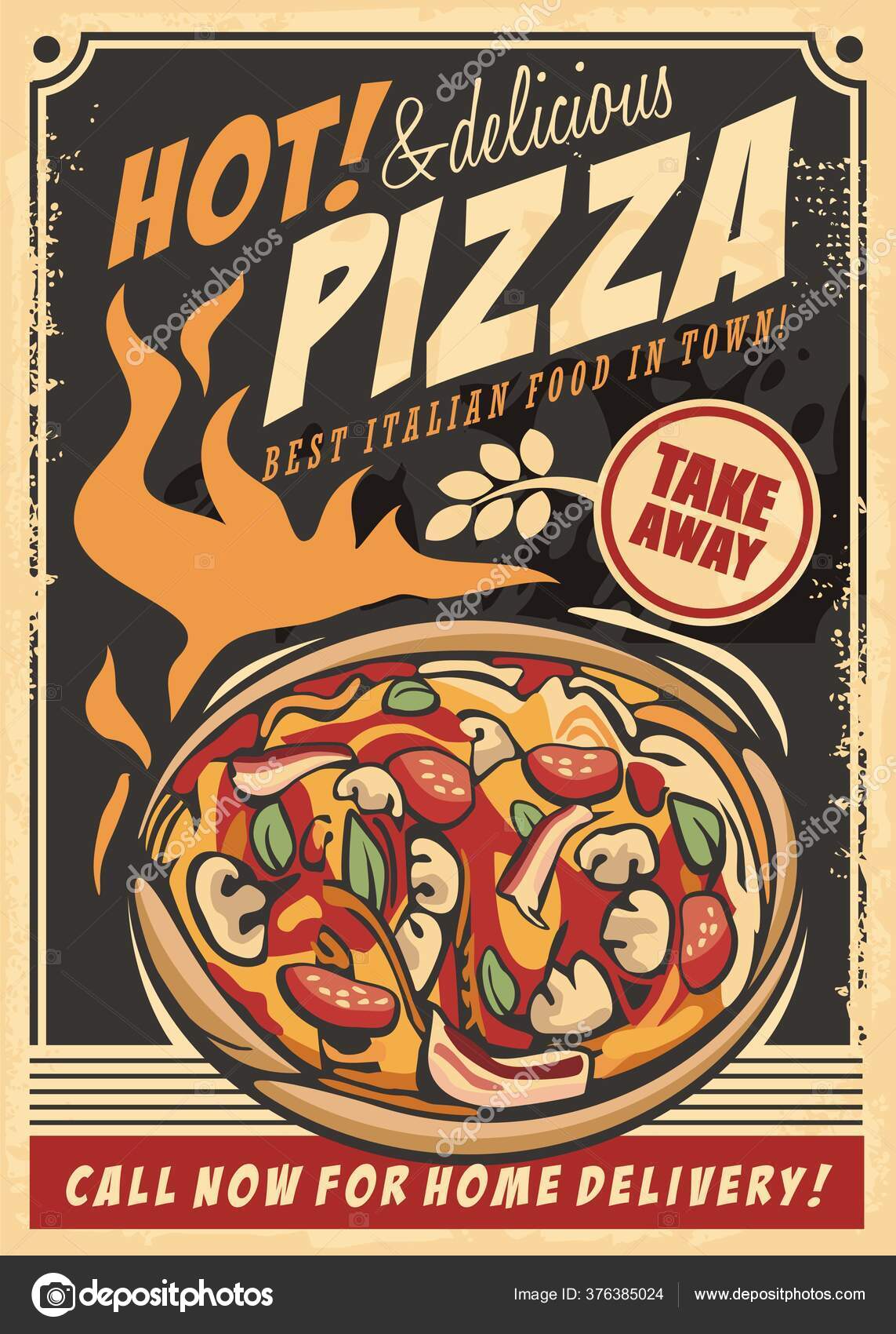 ホットピザおいしいイタリア料理レトロ広告テンプレート おいしいピザと火の上に様々な成分とポスターデザイン古い紙のテクスチャ上のヴィンテージベクトルピッツェリアのサイン ストックベクター ©lukeruk 376385024。