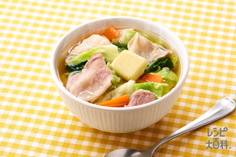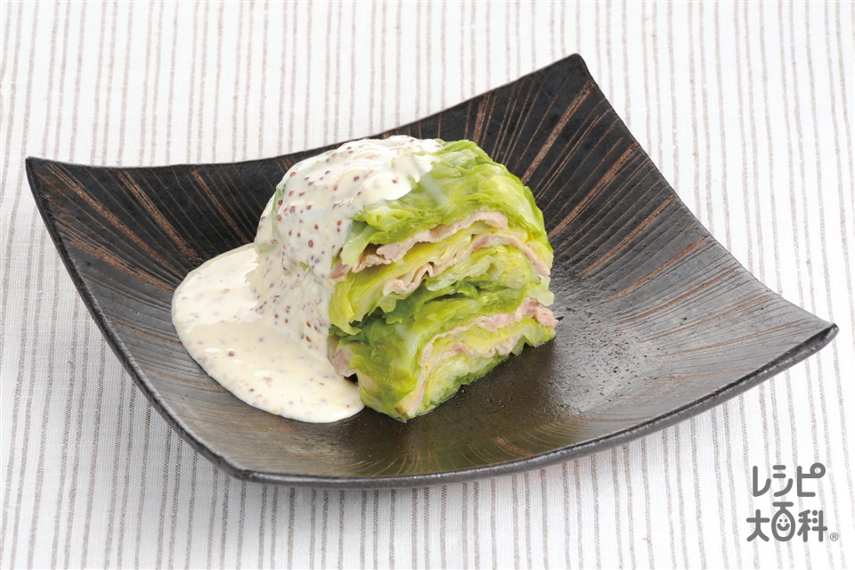 ラザニアの献立 主菜:キャベツと豚肉の重ね蒸しサラダ、汁物:「クノール カップスープ」コーンクリーム 献立 ・メニュー 味の素パーク たべる楽しさを、もっと。