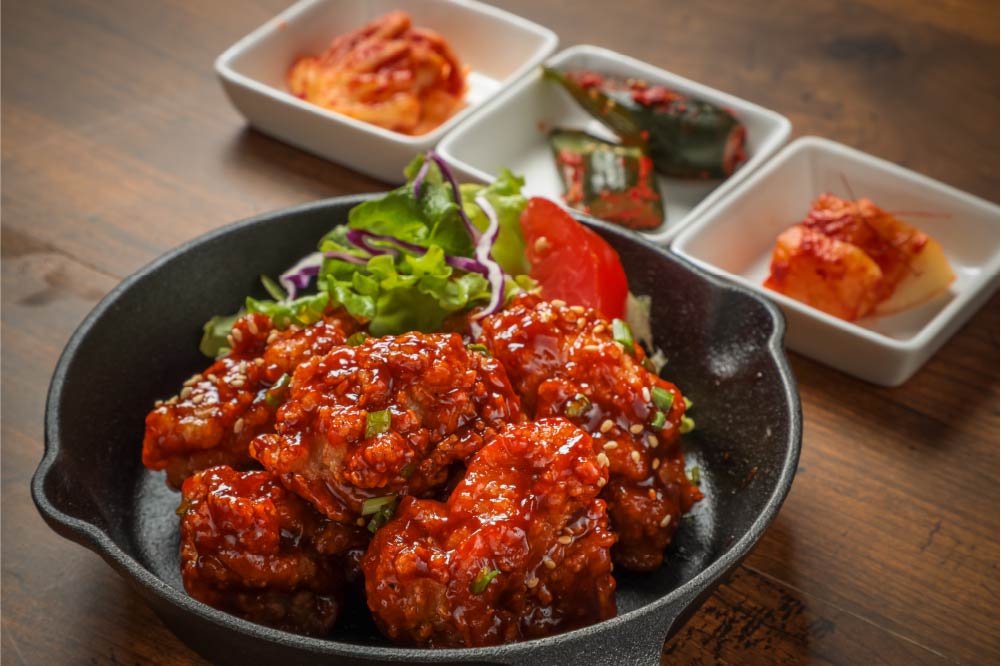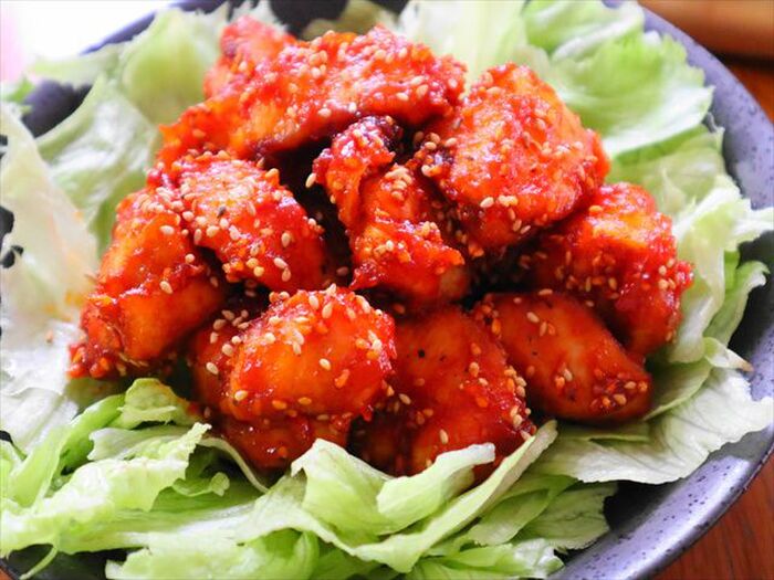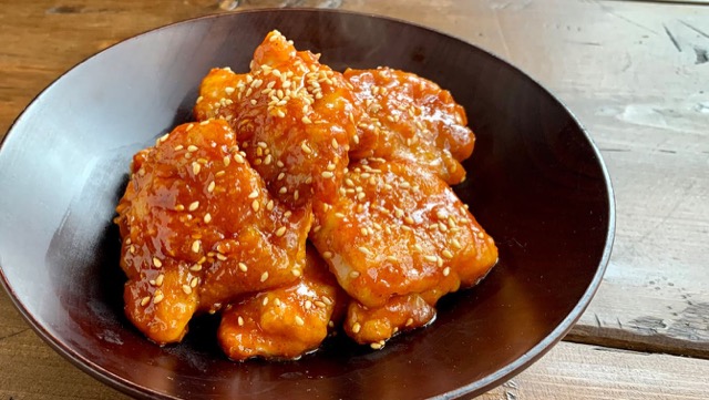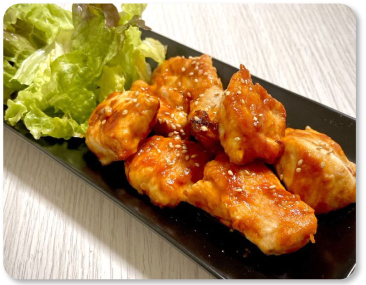 甘辛さがクセになる鶏ムネ肉の「ヤンニョムチキン」。