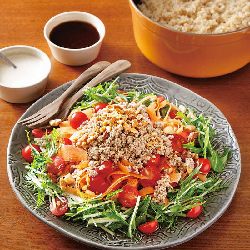たっぷり野菜と豚そぼろのあえサラダ アジアンソース・クリーミーソース。