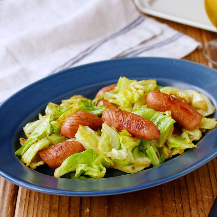 キャベツとソーセージのマヨカレー炒め。