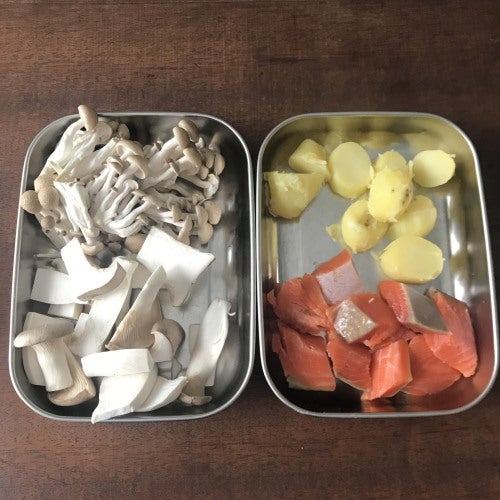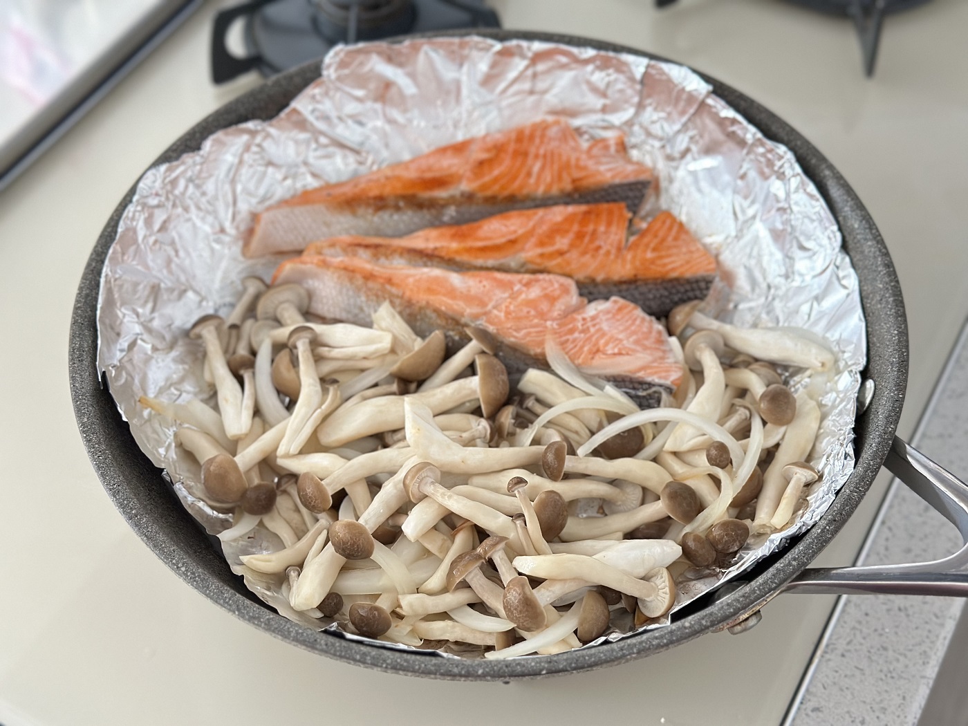 土曜はナニする!?のレシピ③ 簡単!!魚レシピ フライパン1つで!鮭ときのこのアクアパッツァ。