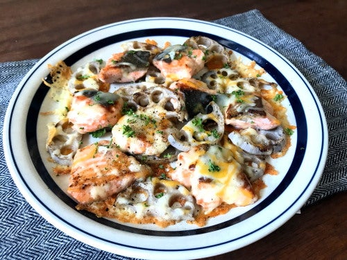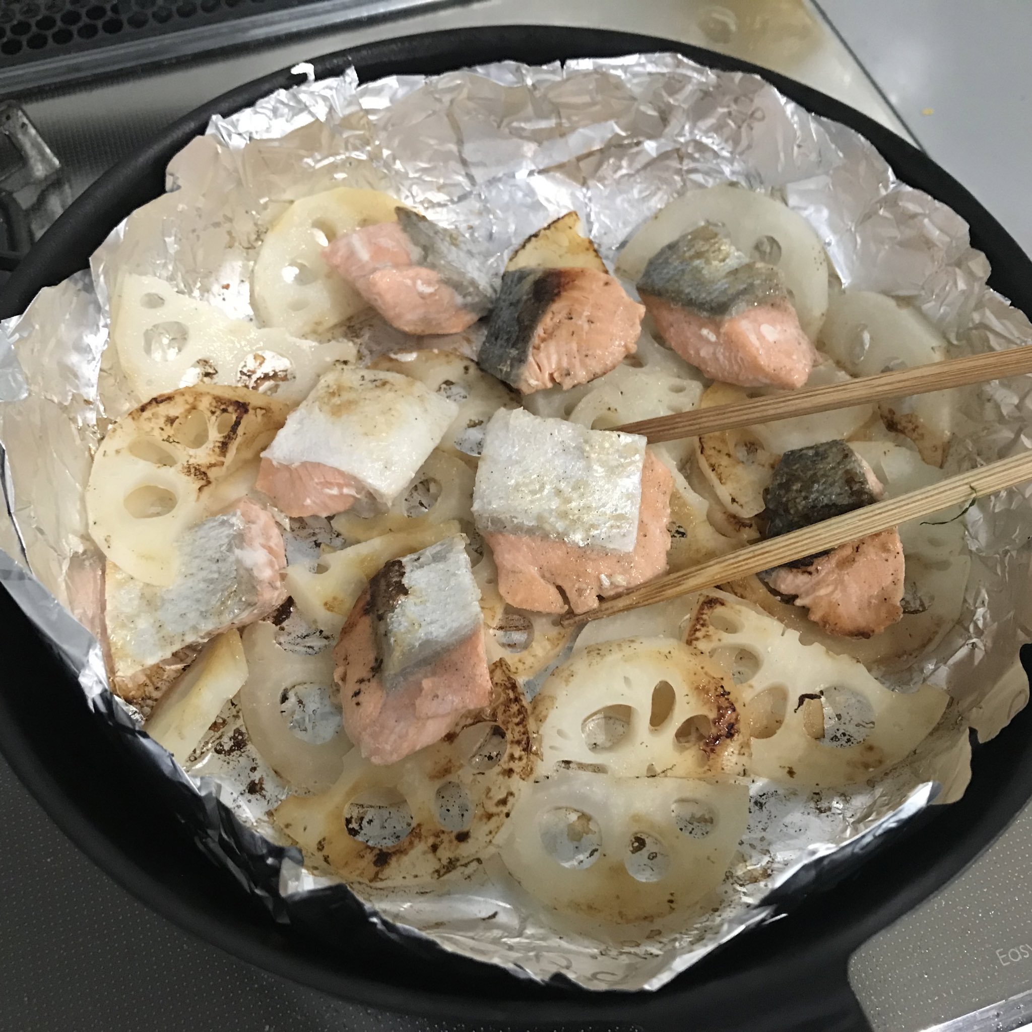 材料ほぼ3つ!魚レシピ 鮭とれんこんのチーズ焼き*キチントさんフライパン用ホイルシート活用。