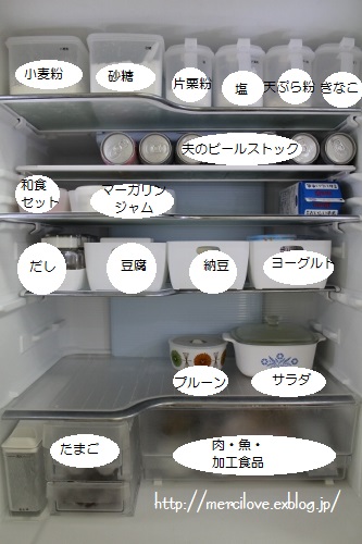 100均セリアのアイテムで*冷蔵庫白い収納 : merci。