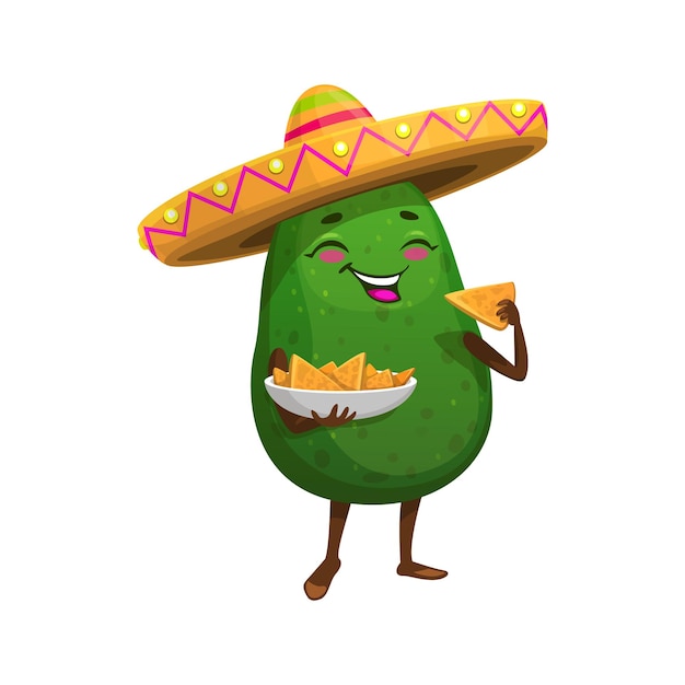 ソンブレロ ベクトル絵文字絵文字でナチョス チップを食べるメキシコのアボカドの漫画のキャラクター メキシコ料理の食品やスナックパッケージのボウルにナチョ カップとかわいい面白い笑顔のアボカドPremiumベクトル素材。