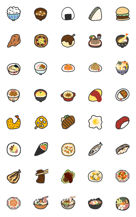 LINE絵文字 いつでもご飯。 ごはん大好き。食べるの大好き。朝昼晩夜食もたべちゃう。おやつはおにぎり。コンビニ弁当にからあげは外せない!可愛い食べ物の絵文字だよ。