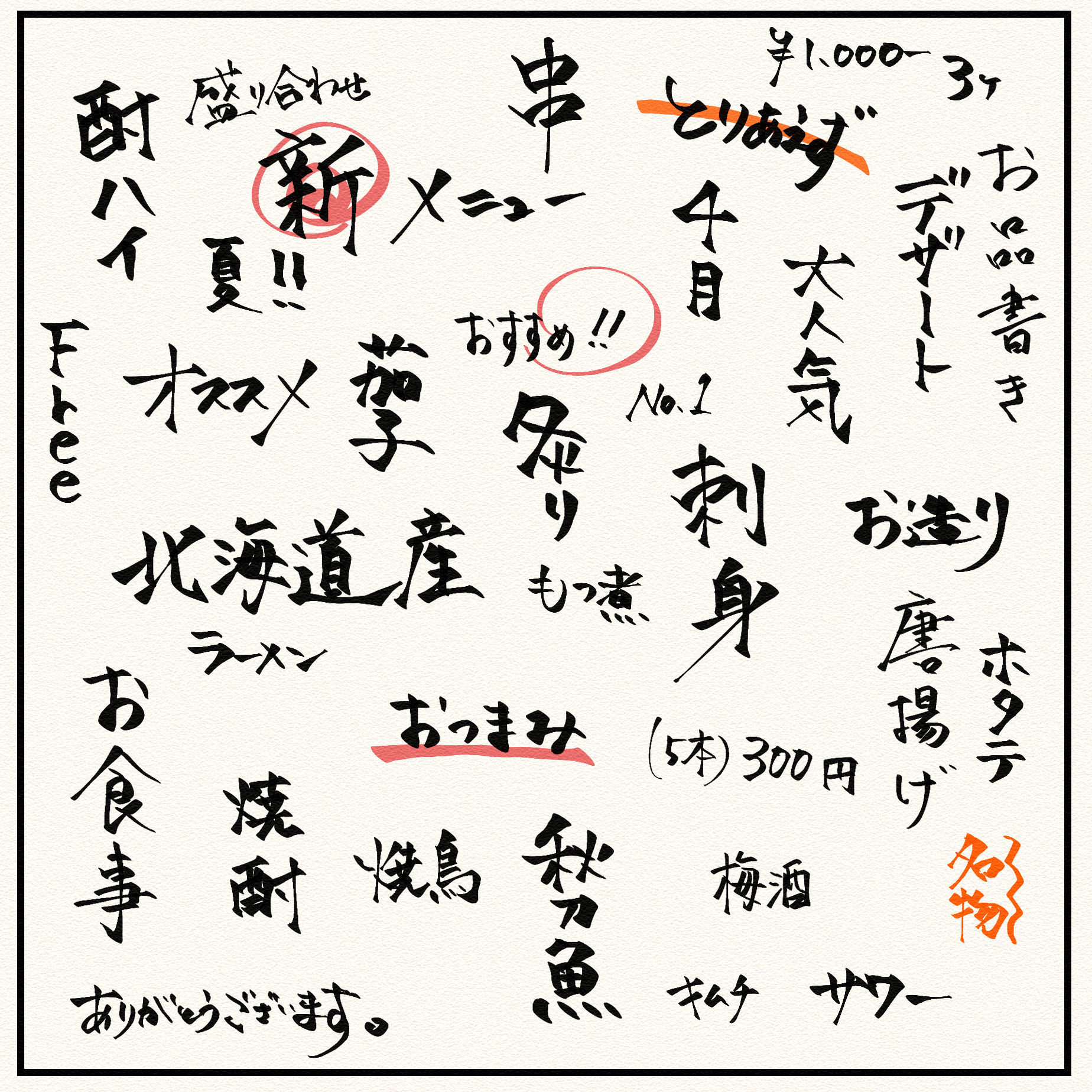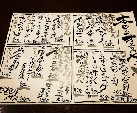 居酒屋メニュー・オススメ・チラシを筆文字で書きます 飲食店さん向け!手書きの温かみのあるメニューを作ります!ココナラ。