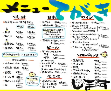 筆ペン.ボールペンで飲食店様のメニュー手書きします 文字と簡単なイラストで見やすいメニューを。ココナラ。
