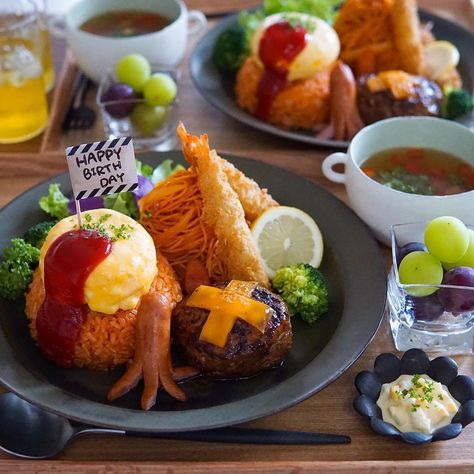 HAPPY BIRTH DAY⚐゙ ・ 昨日は旦那の誕生日でした👨🏻🥂 この前好評やったチーズインまんまるオムレツのオムライスでお子様ランチ風プレートに⚑*゚ 照り焼きハンバーグ海老フライ サラスパナポリタン たこさんウィンナー 野菜スープ ・ ・ 33-16=17回目の 誕生日😳ヒェ。