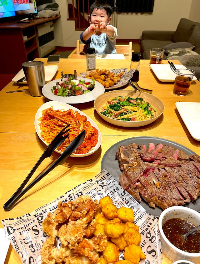 今日は旦那の40歳の誕生日でした✨ 去年同様、ステーキに🥩 メニュー ・ステーキ ・エビ焼き ・シチュー ・ポテサラハム巻き ・ナポリタン・付け合わせサラダ ・パン 子供達手作りケーキ スポンジは購入してるので 生クリームといちごのデコレーションを子供が担当です。