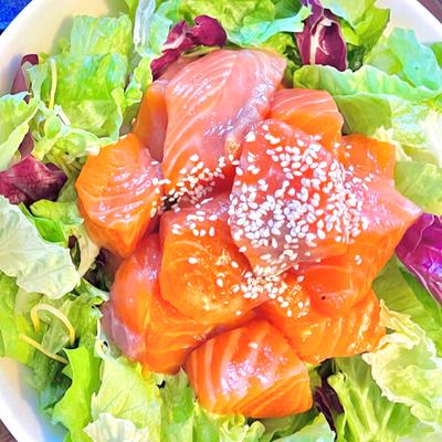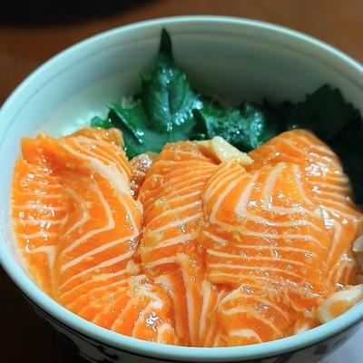 ごま油で香ばしいサーモン漬け丼。