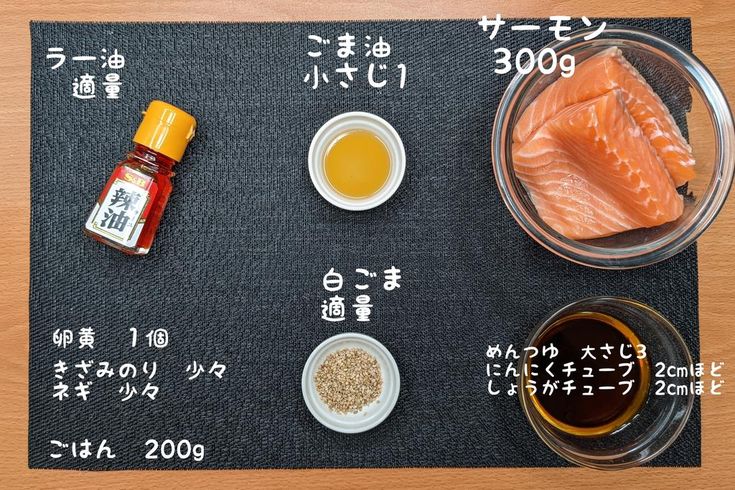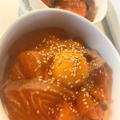 まるみキッチン 簡単レシピon X: " サーモンでにんにく醤油漬け丼①耐熱容器で料理酒・醤油各大さじ2混ぜたら600w30秒チンしてアルコールを飛ばしたら粗熱が取れるまで冷ます ②にんにく1かけ、サーモン150gをスライス③①、②、ごま油大さじ1を合わせ10分ほど。