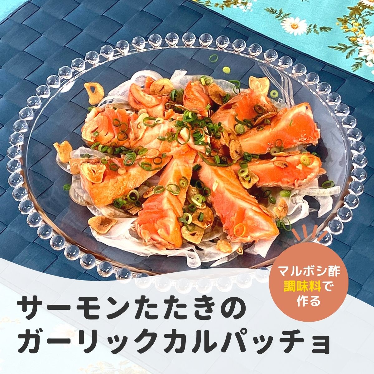 サーモンたたきのガーリックカルパッチョマルボシ酢。