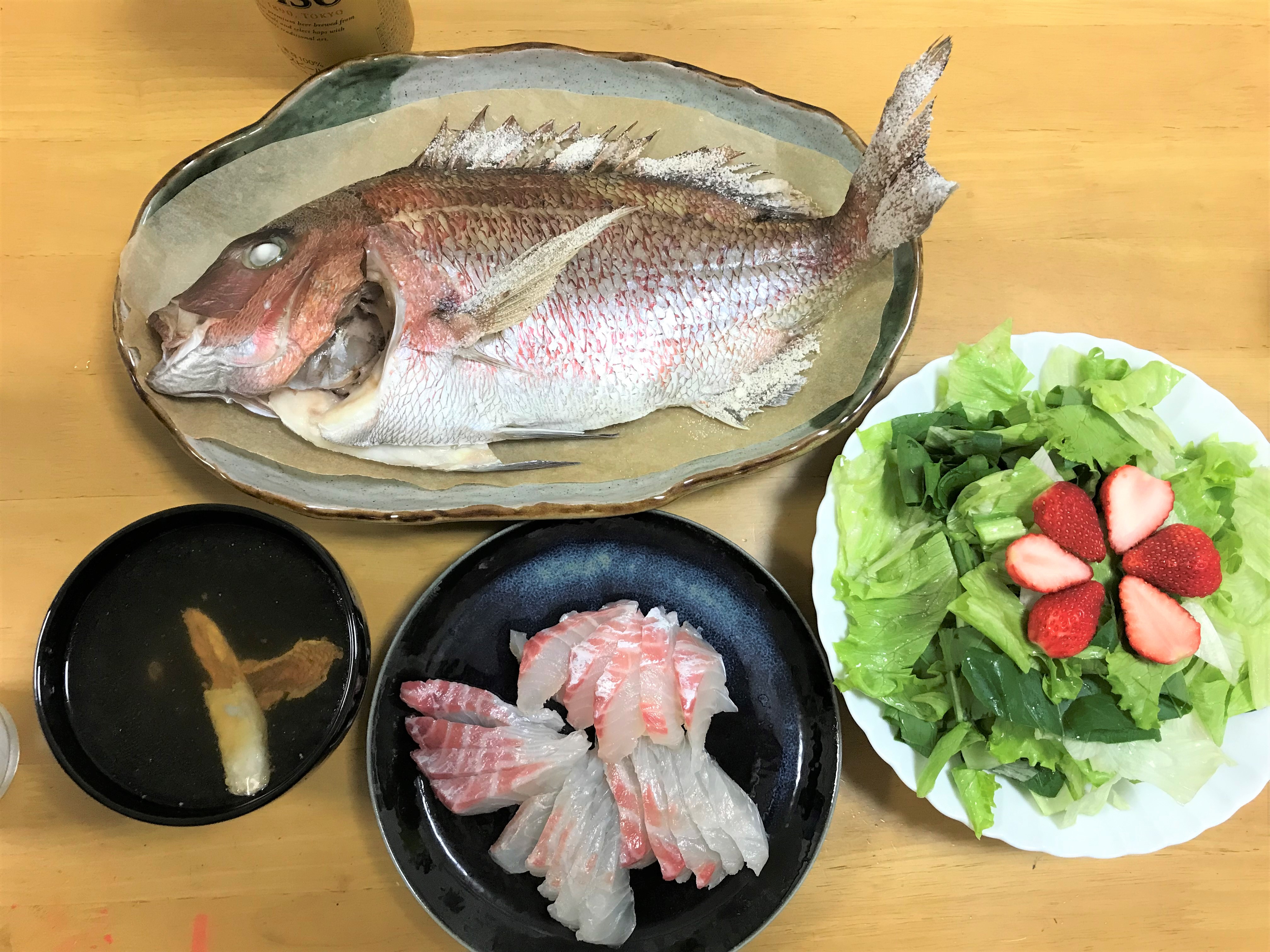 メイチダイの鯛飯・潮汁とイサキの塩焼き定食釣った魚で釣り飯。