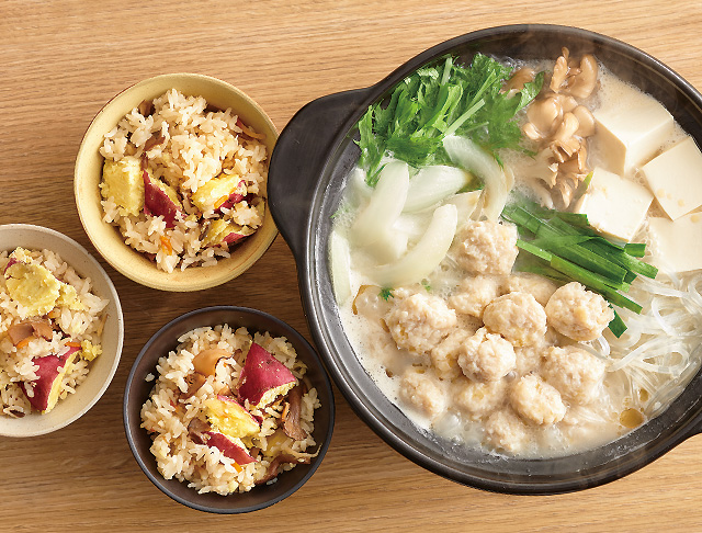 ふわふわだんごの鶏鍋、丸ごとさつま芋の松茸ごはんeフレンズ ぱくぱく献立くん。