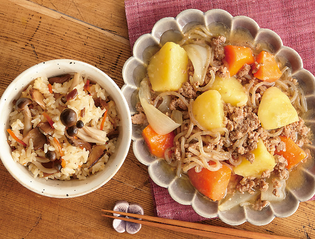 ひき肉で肉じゃがみそ仕立て、松茸の炊き込みご飯eフレンズ ぱくぱく献立くん。