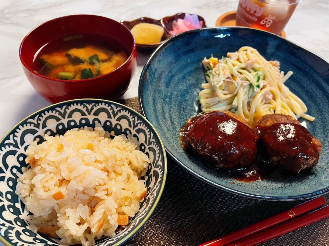 松茸ご飯に鶏肉の甘辛かけのお昼ご飯生活ホーム和気あいあい。
