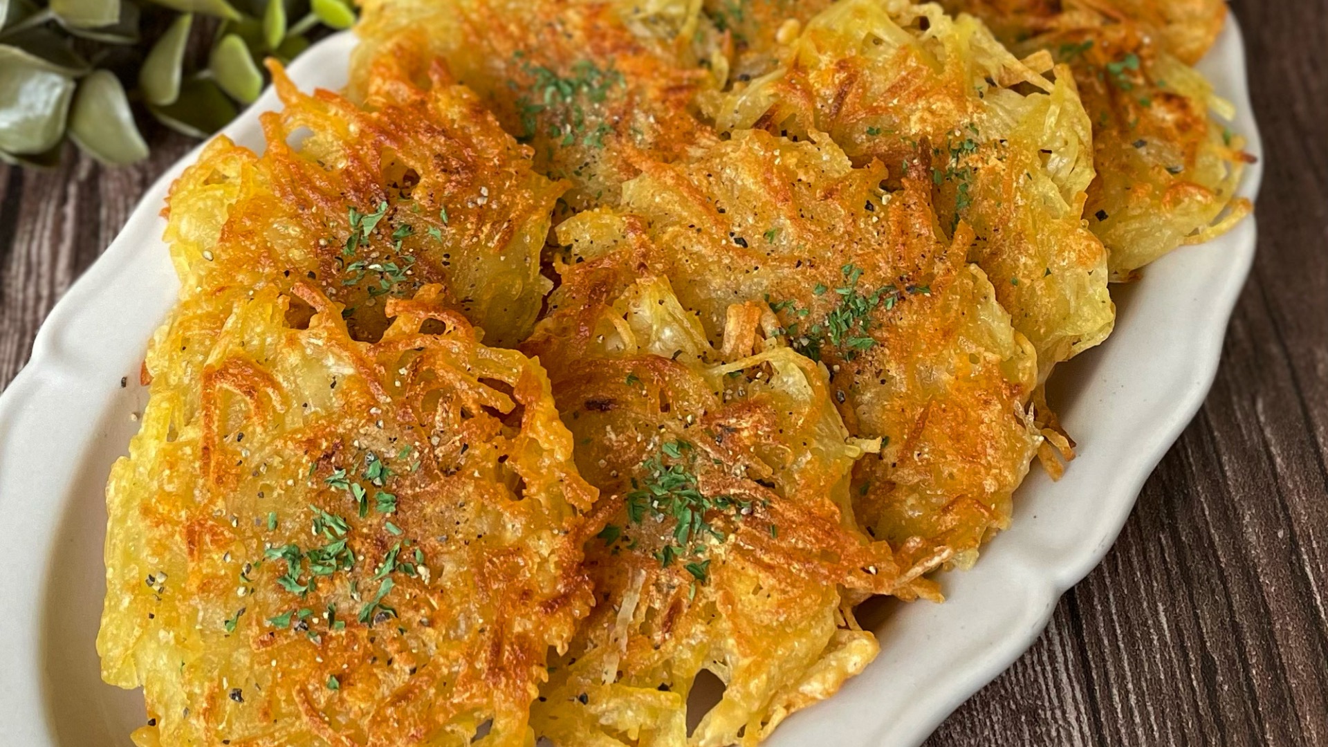 揚げずにカリカリ!ホクホク!じゃがいもだけで作れる「じゃがいもガレット」 フライパンで簡単材料3つ。