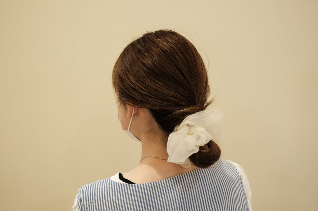 シュシュを使った暑い日のお団子ヘアアレンジ。