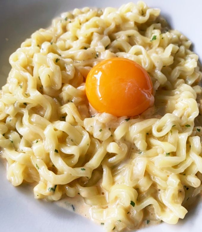 辛ラーメンのアレンジ人気No.1カルボナーラ風!牛乳や生クリームを使ってマイルドに暮らしニスタ。