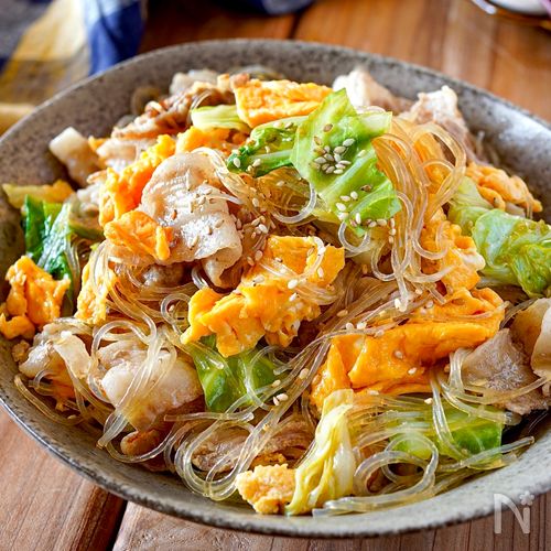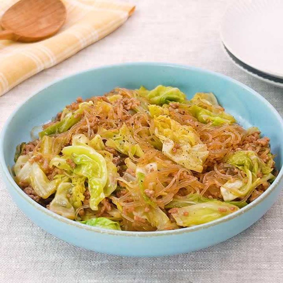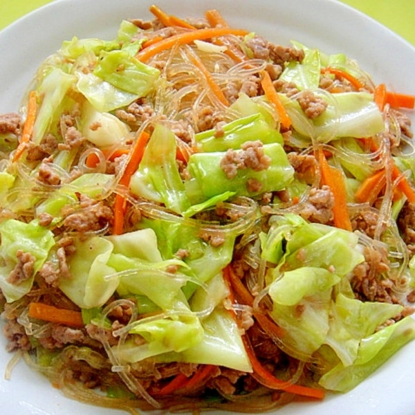 キャベツと豚ひき肉の春雨炒め。