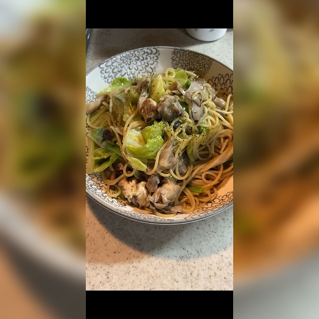 フライパンで簡単鯖缶ペペロンチーノレシピ。