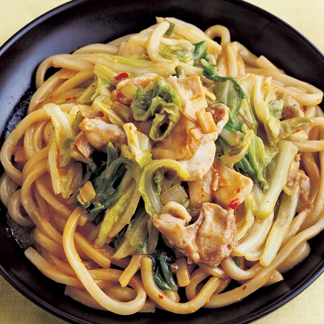 ピリ辛味があとを引く! 鶏肉のキムチ焼きうどん。