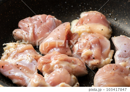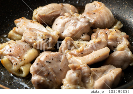 鶏もも肉 角切り をフライパンで焼く。 塩こしょう焼き の写真素材103399855- PIXTA。