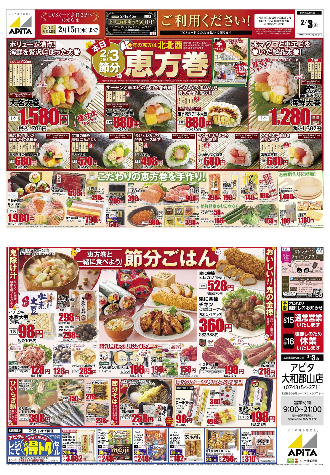 2023年2月3日 金 は「節分」です 開運恵方巻「まいにちの暮らしに安心・品質・お手頃感を」 アピタ・ピアゴ。