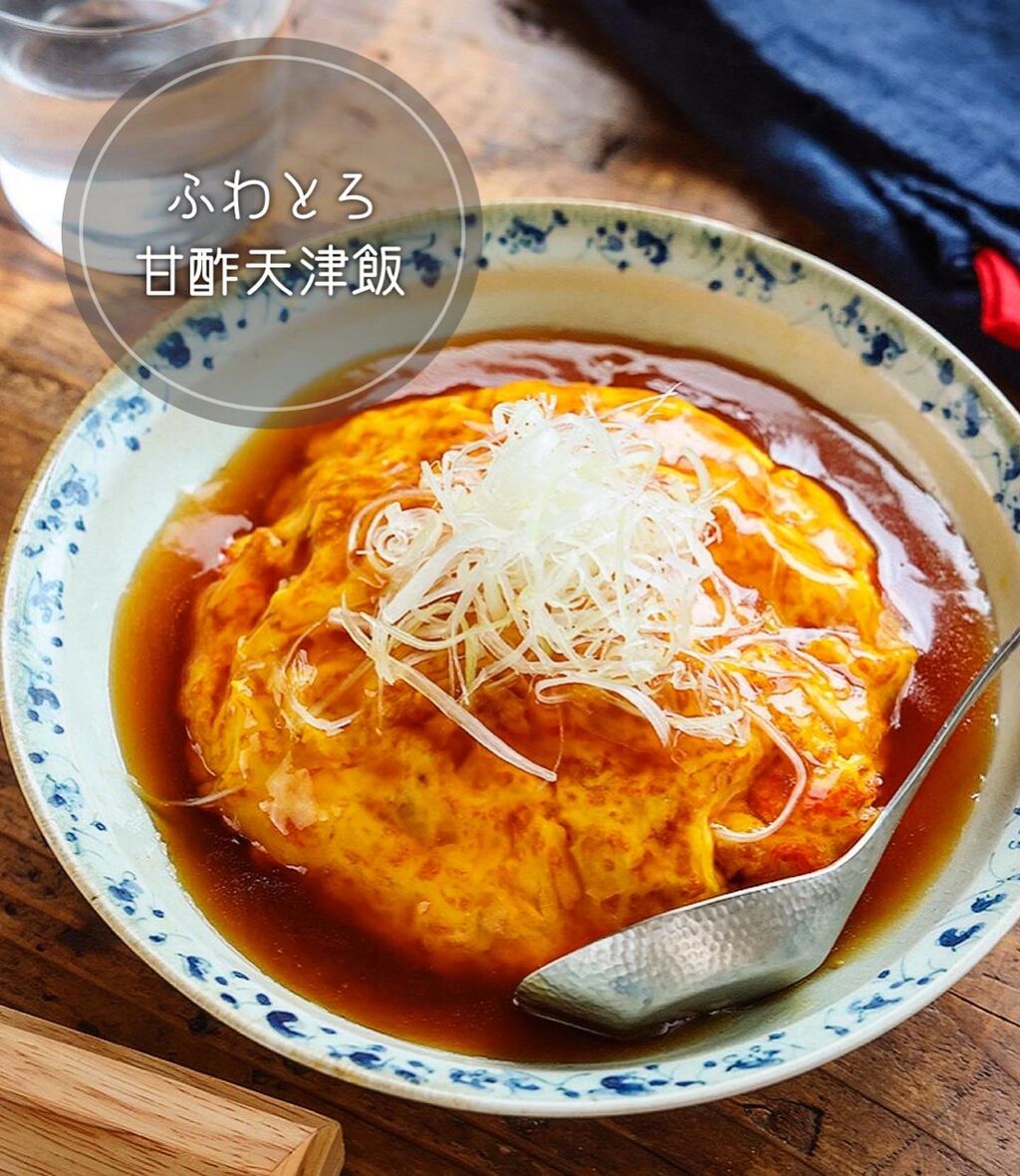 かに玉の素で♪ふわトロ卵の甘酢あんかけ天津飯・ 今日は甘酢な気分でしょうか?😋たっぷり卵を使ってくださいました!🥚フライパンだけで作れる簡単時短なレシピです🍳 ・ こちらの素敵なお写真は @yukaka.gohan さんの一品です♪作り方も教えていただきましたので。