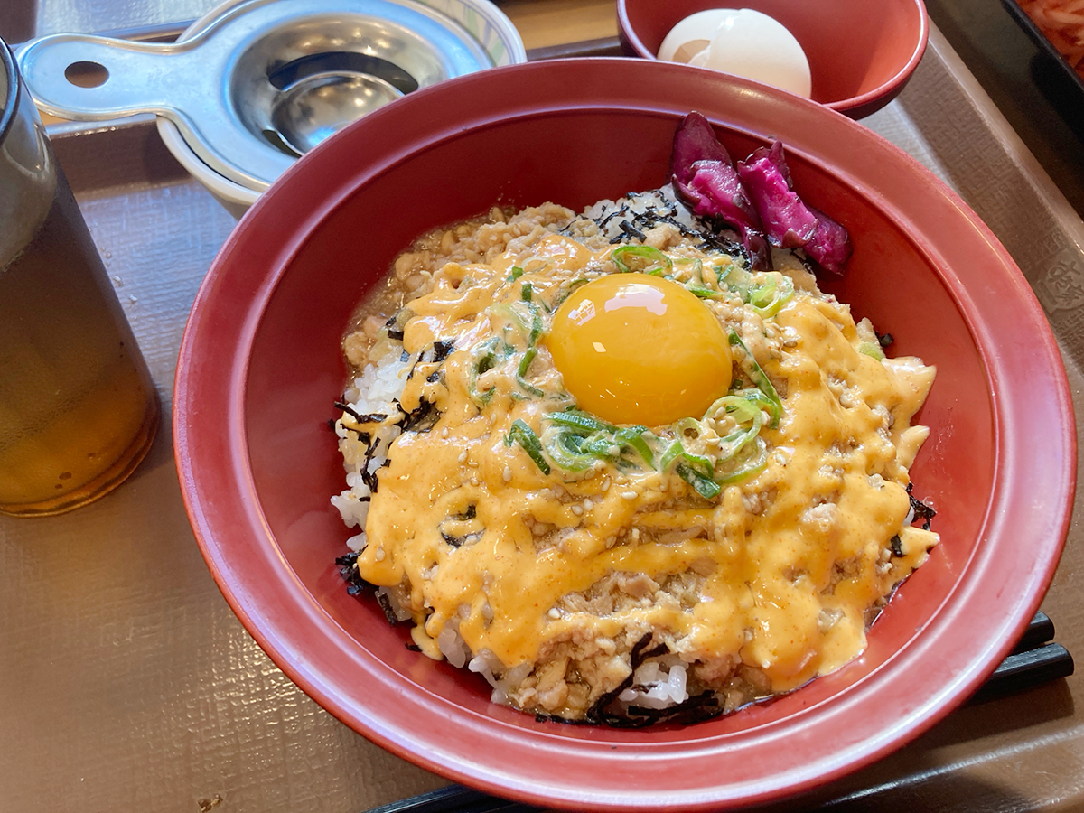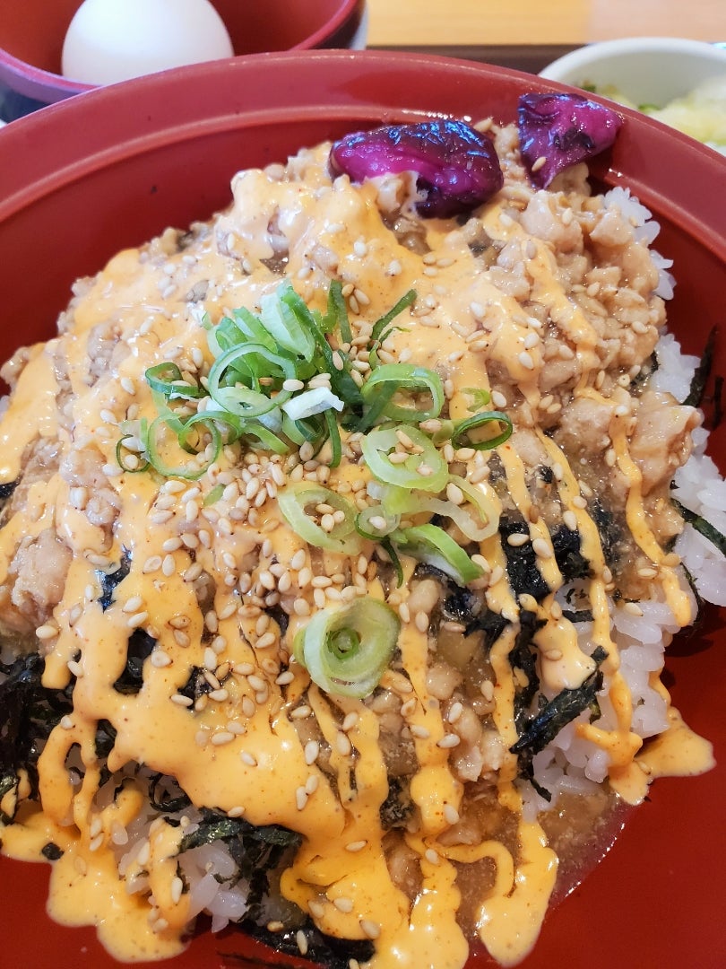 すき家のおすすめ食べ方: 鶏そぼろ丼明太マヨ - チーズトッピング。