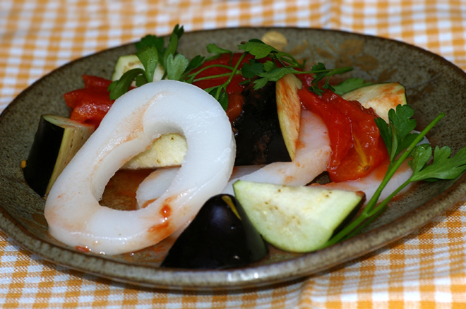 ちょいと一品 水茄子とトマトのオリ醤油。