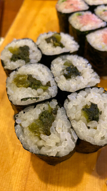 わさび巻き、通称涙巻き😉ワサビの葉や茎の部分を使った巻き寿司です🌿スッキリ爽やかで、脂ののったお魚の箸休めとして、締めの一品としておすすめです😊.江戸前寿司森下グルメ清澄白河グルメ清澄白河寿司森下寿司屋江東区グルメ江東区鮨寿司下町。