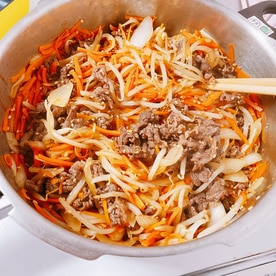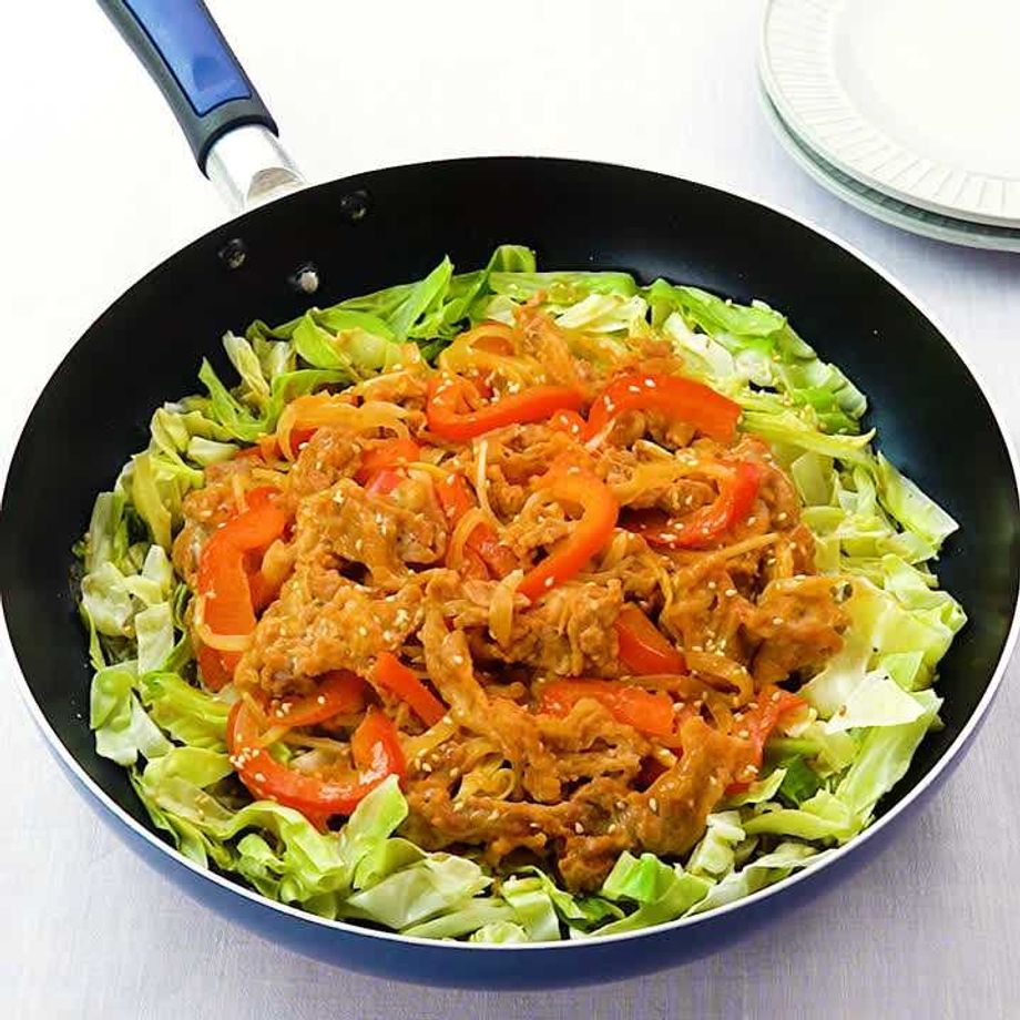 家計にやさしい節約レシピ♪ 春キャベツとプルコギ風豚肉のフライパン蒸し。
