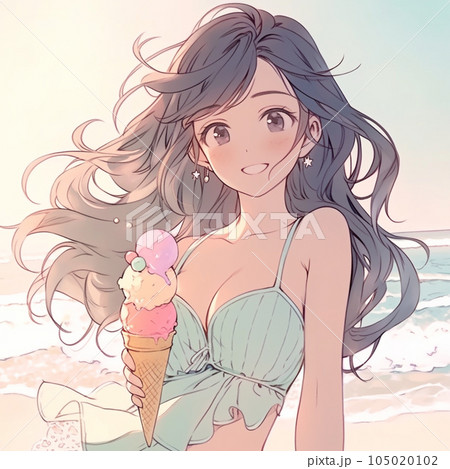 海でアイスクリームを食べる女の子のイラスト素材102027315- PIXTA。