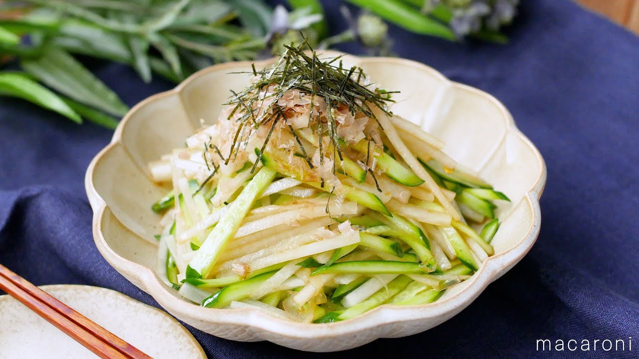 きゅうりと大根サラダ ポン酢とごま油でやみつき!大根ときゅうりのシャキシャキ食感が心地よい♪macaroni マカロニ。