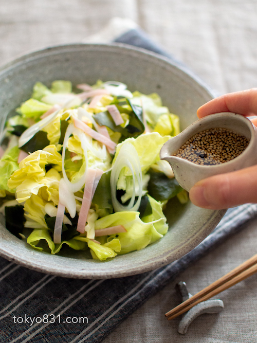 キャベツとハムのポン酢和え<胡麻油で風味付け> - おうちで楽しむ簡単レシピ。