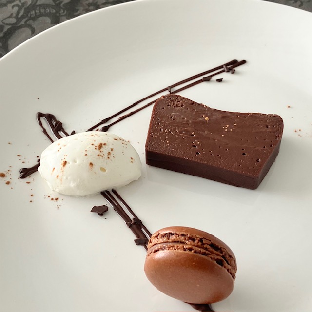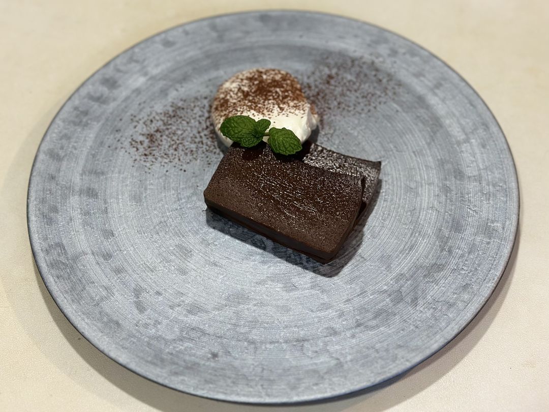 ショコラテリーヌ〟 〜ライム香るマンゴーソース〜 フランス産チョコレートを使った 濃厚なケーキになっております。よし奈yoshina創作和食岐阜ランチデザートランチガトーショコラマンゴーショコラテリーヌデセール皿盛りデザート。