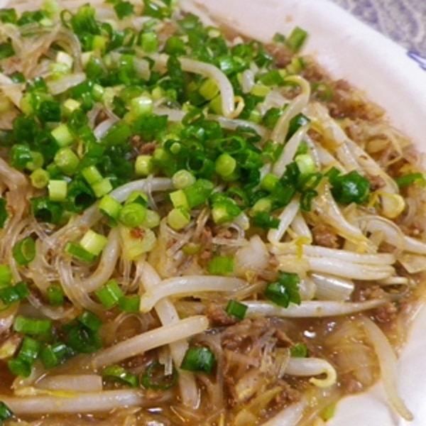 炒めるだけで簡単ガッツリ♪ もやしと豚ひき肉のピリ辛味噌丼。