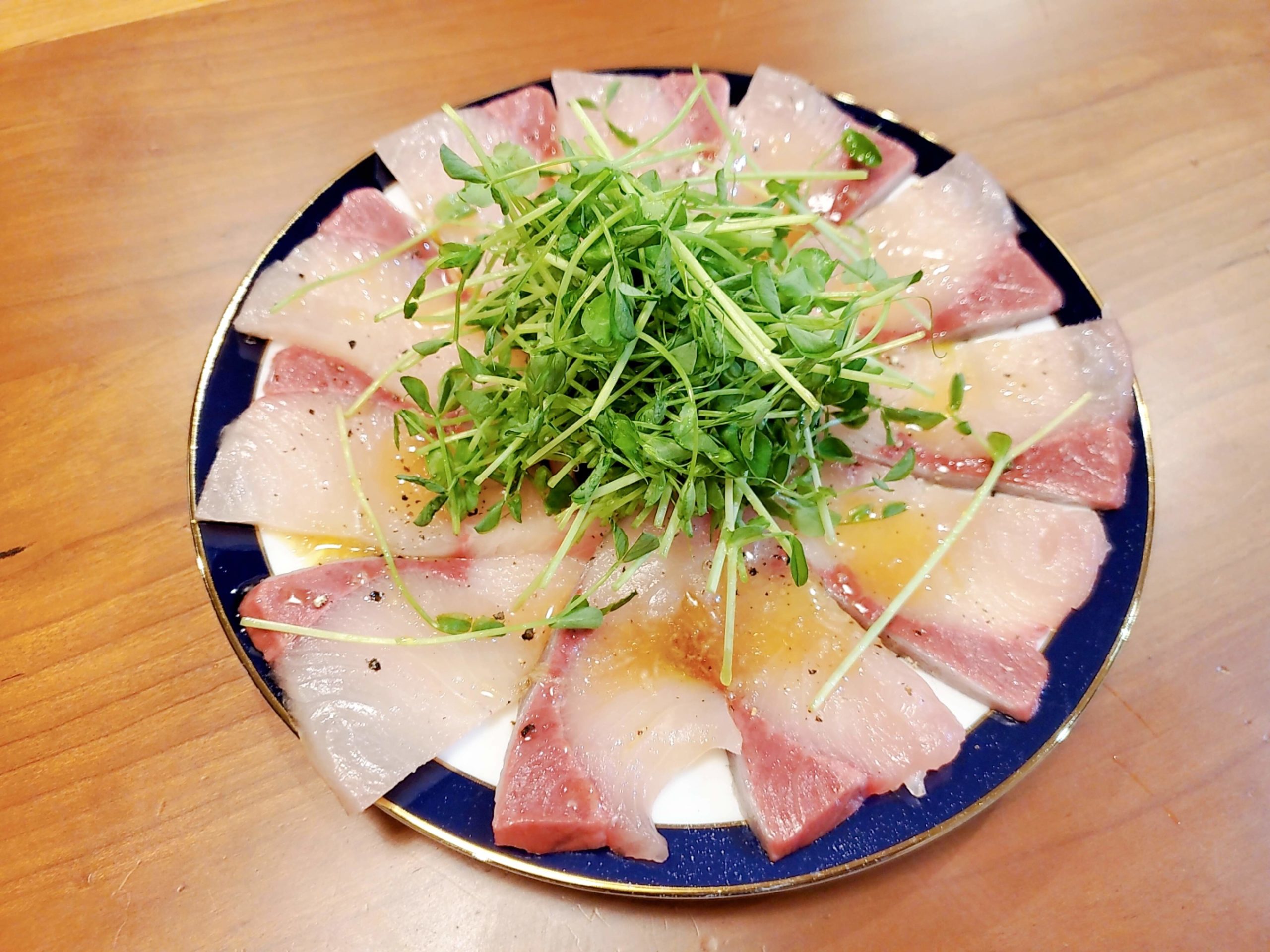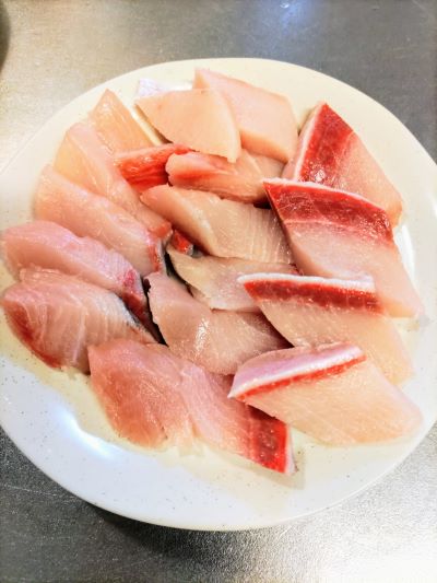5年ぶりブリの切り身を刺身に: バーボン植田のカリテプリ。
