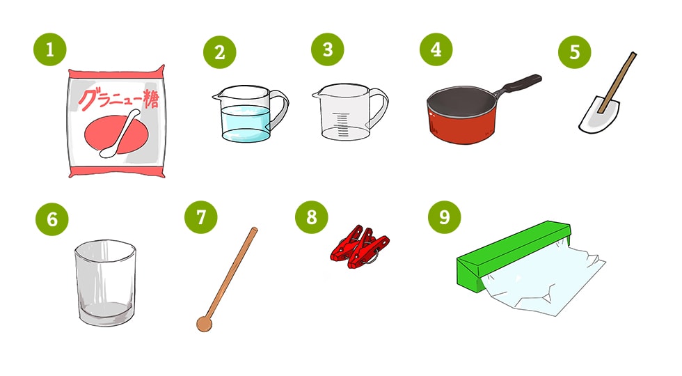 砂糖の結晶化の過程をロックキャンディー作りで確かめよう!バンダイによる、遊びと学びのココロ育むファミリーエンタメサイト。