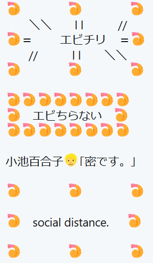 0gaw@ on X: "🍤 🍤 🍤 \\ l l🍤= エビチリ =🍤l l \\ 🍤 🍤 🍤🍤🍤🍤🍤🍤🍤🍤🍤 🍤 エビちらない 🍤 🍤🍤🍤🍤🍤🍤🍤🍤 小池百合子👱「密です。」 🍤 🍤 🍤 🍤social distance. 🍤 🍤 🍤 🍤"X。