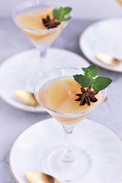甘さひかえめ桃のコンポート〜カルダモン風味〜フードコーディネーターによる「クッキングアートサイト美膳」。