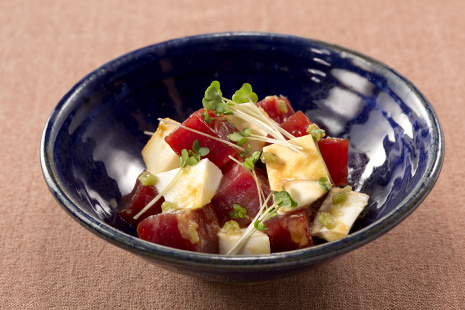 まぐろとモッツァレラチーズのわさびじょう油和え。