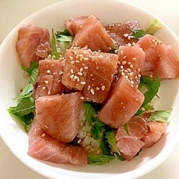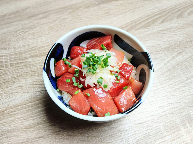 ごま油でおいしい~びんちょうマグロのぶつ切り漬け丼。