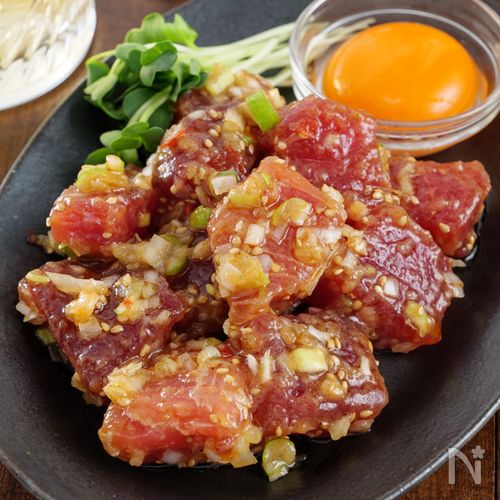 卵黄でとろける ぶつ切りマグロのユッケ風ねぎだく中華。