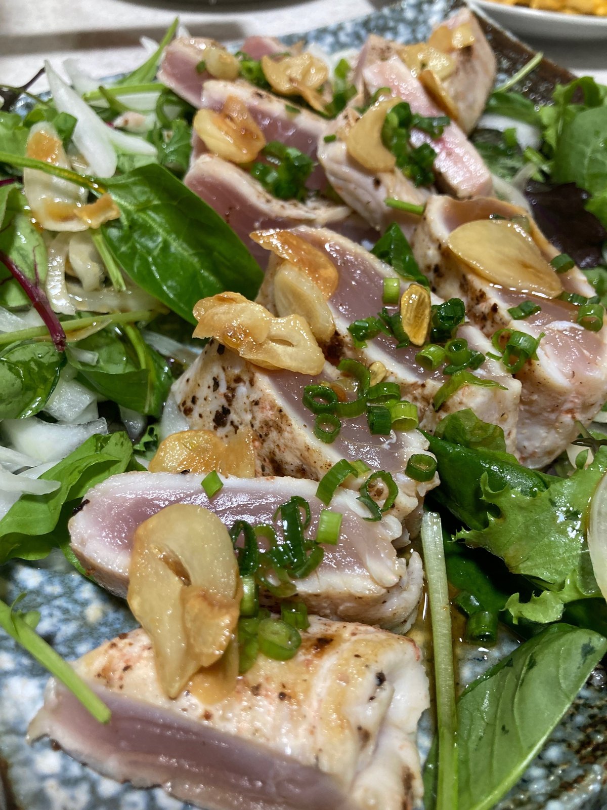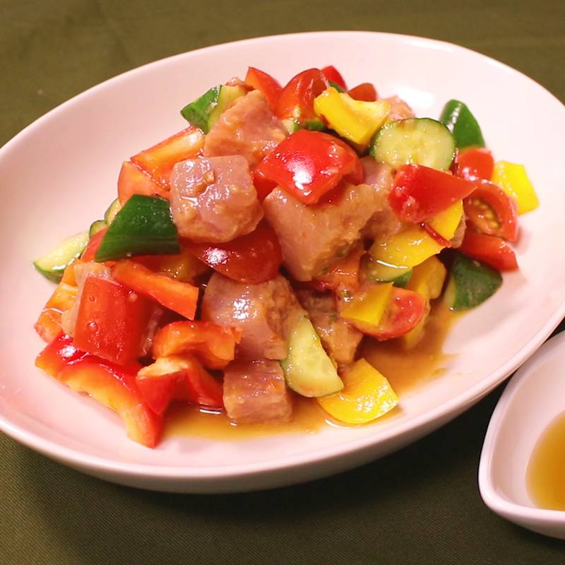 ビンチョウマグロと彩り野菜のピリ辛和え。