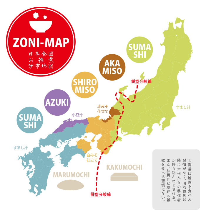 地域毎のお雑煮の違い。味噌・醤油・あずき・その他餅や具材の違いを解説。