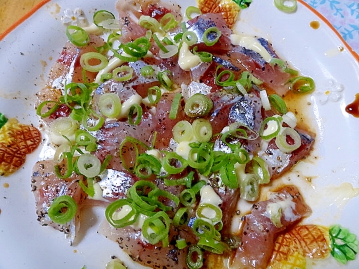 ピリッとアクセント! アジのカルパッチョ マスタード醤油風味。