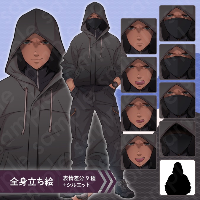 立ち絵素材 フードを被った怪しい雰囲気の悪役風男性モブキャライラスト・現代・全身表情5種+マスクあり4種+α - 素材POMPACK - BOOTH。